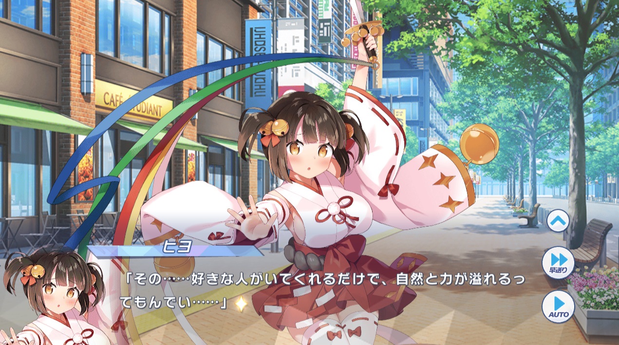 地元愛は人一倍で、地域のみんなを守るために星騎士になった。得意の神楽舞で味方を癒すことができる。基本的にサポートに回るが、自分でぶん殴りに行くこともある。