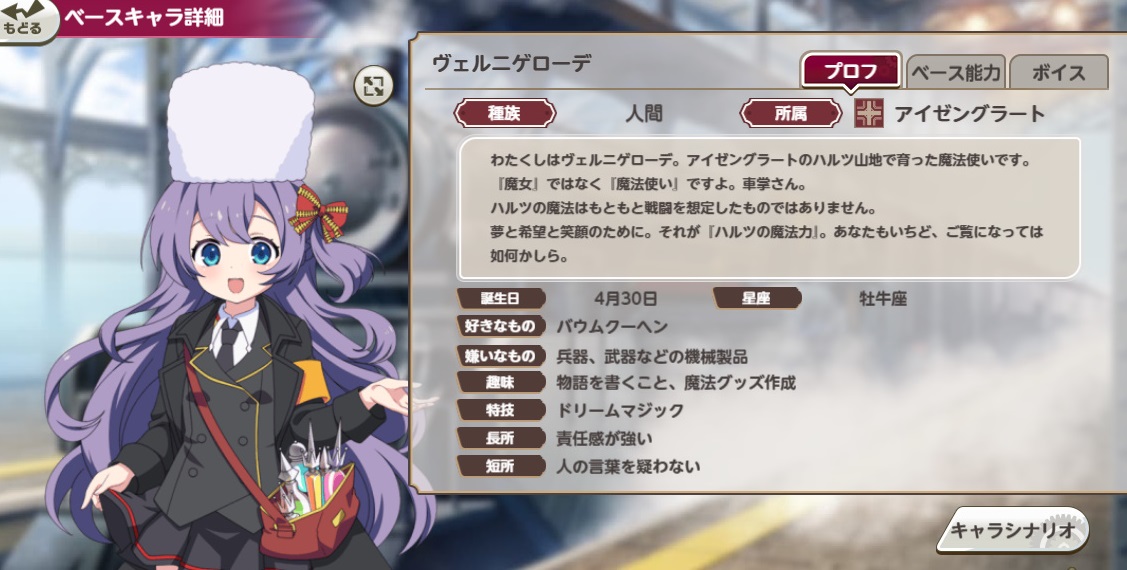 わたくしはヴェルニゲローデ。アイゼングラートのハルツ山地で育った魔法使いです。 『魔女』ではなく『魔法使い』ですよ。車掌さん。 ハルツの魔法はもともと戦闘を想定したものではありません。 夢と希望と笑顔のために。それが『ハルツの魔法力』。あなたもいちど、ご覧になっては如何かしら。