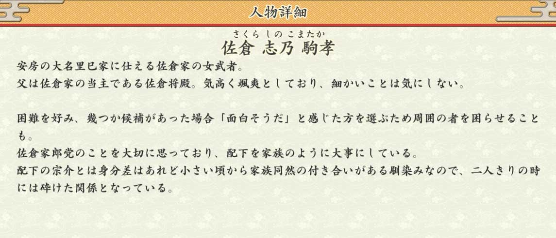 困難を好み、幾つか候補があった場合「面白そうだ」と感じた方を選ぶため周囲の者を困らせることも。 佐倉家郎党のことを大切に思っており、配下を家族のように大事にしている。