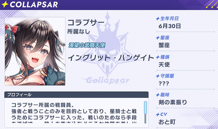 強者と戦うことのみを目的としており、星騎士と戦うためにコラプサーに入った。戦いのためなら手段を選ばず、