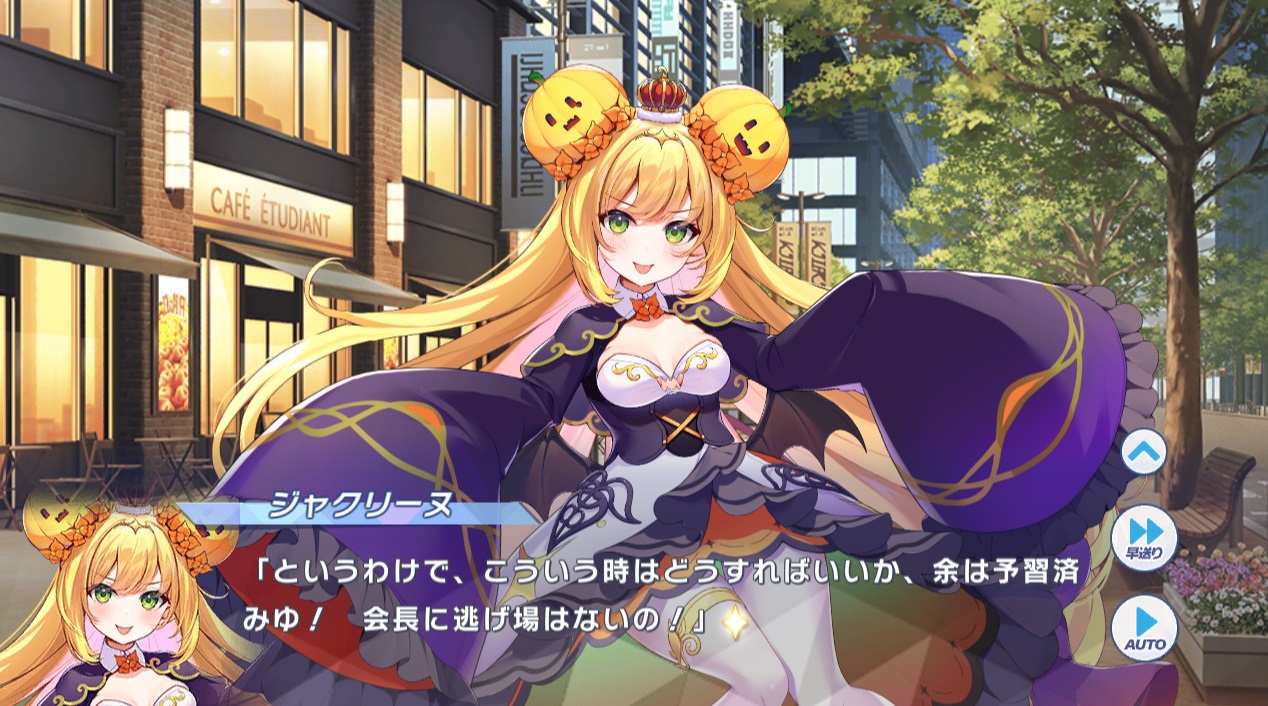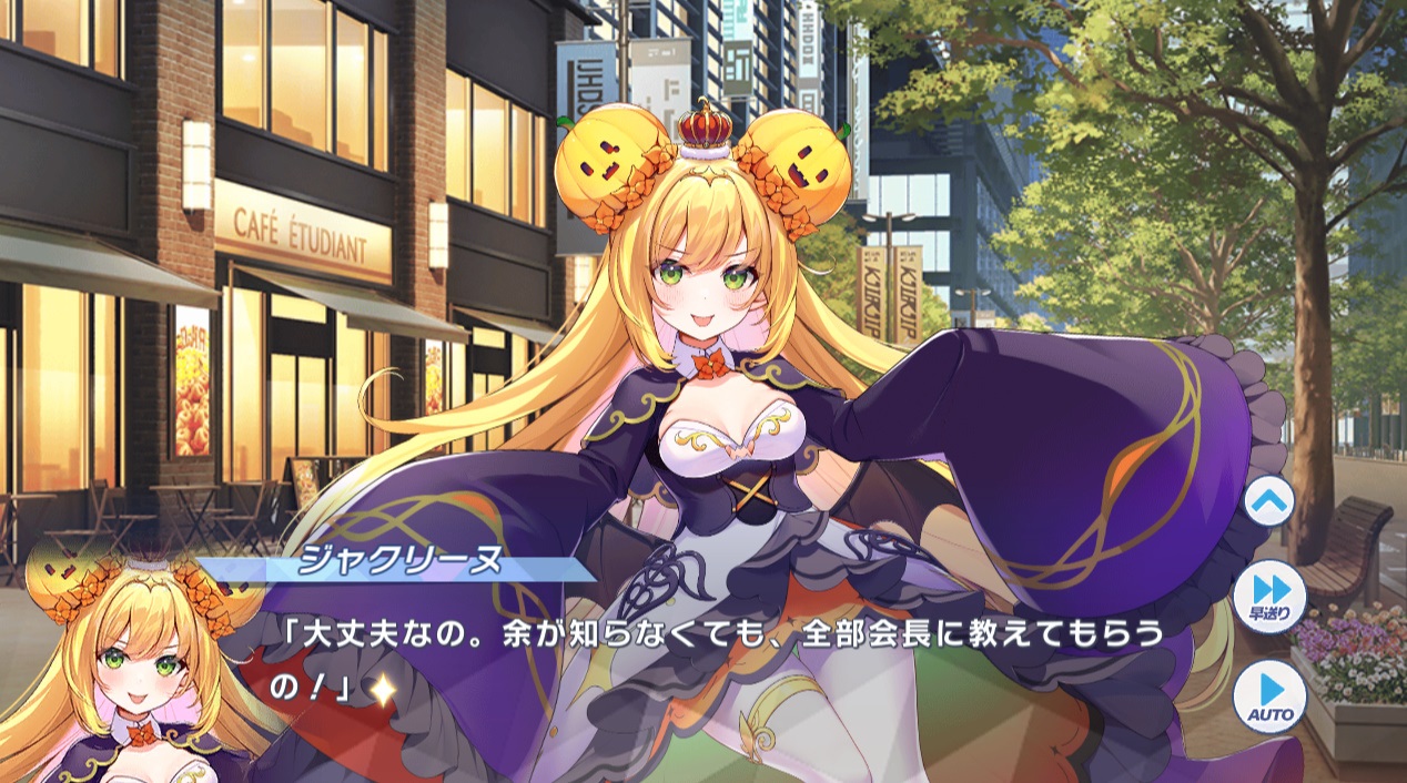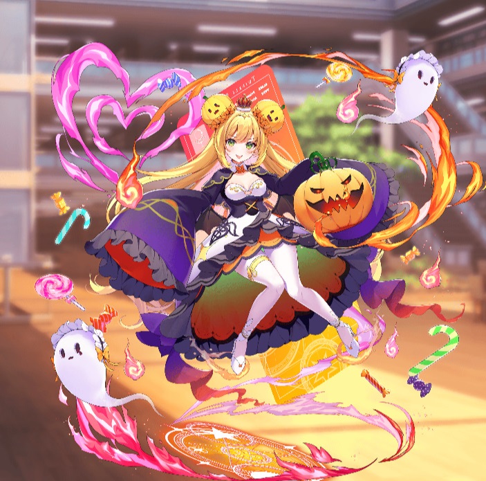 討伐イベント『ー攫千金! 秘密結社のスイートハロウィン』に登場したボス、 ハロウィンの幽霊『ジャツク·オー·ランタン』の娘。 美味しいお菓子に目がなく、父親から学園のハロウィンパーティーの話を聞き、人間界へとやってきた。