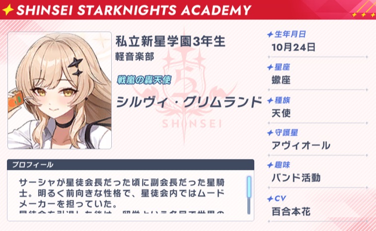 サーシャが星徒会長だった頃に副会長だった星騎士。 明るく前向きな性格で、星徒会内ではムードメーカーを担っていた。