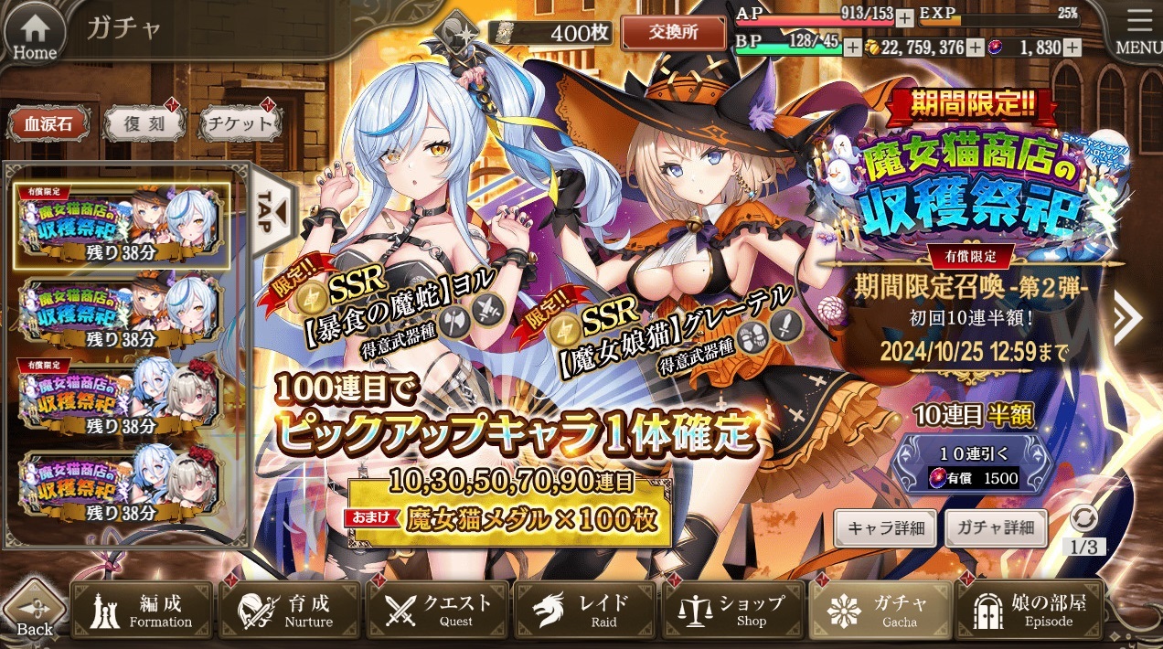 2024年10月 SSR【暴食の魔蛇】ヨル、SSR【魔女娘猫】グレーテル 登場。