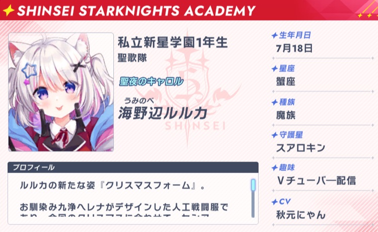 『クリスマスツリー』をモチーフとしており、武器は『キャンディケイン』型のマイク。 その能力は、彼女が歌うクリスマスキャロルに合わせて『バーチャル領域』を周囲に展開するというもの。 領域内では、物理法則が無視され、ルルカの星術が発動すると同時に、即相手に着弾する。 その為、相手は攻撃を回避することができないという、極めて強力な能力である。