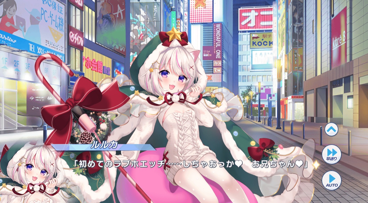 ルルカの新たな姿『クリスマスフォーム』。 お馴染み九浄ヘレナがデザインした人工戦闘服であり、 今回のクリスマスに合わせて、セシア、フェニエルの衣装と共に制作された。