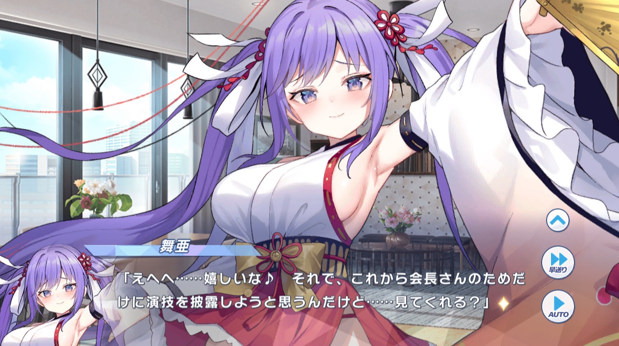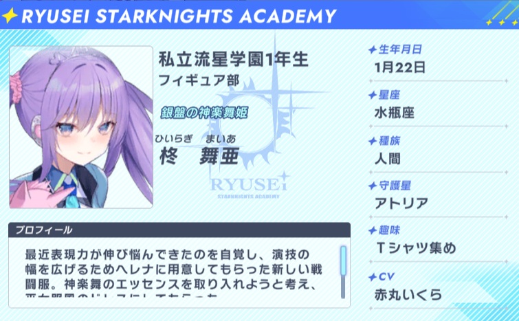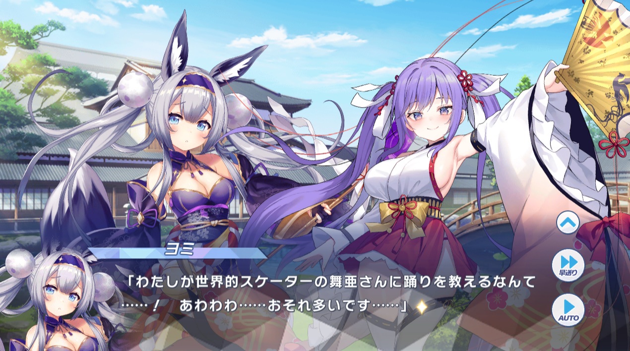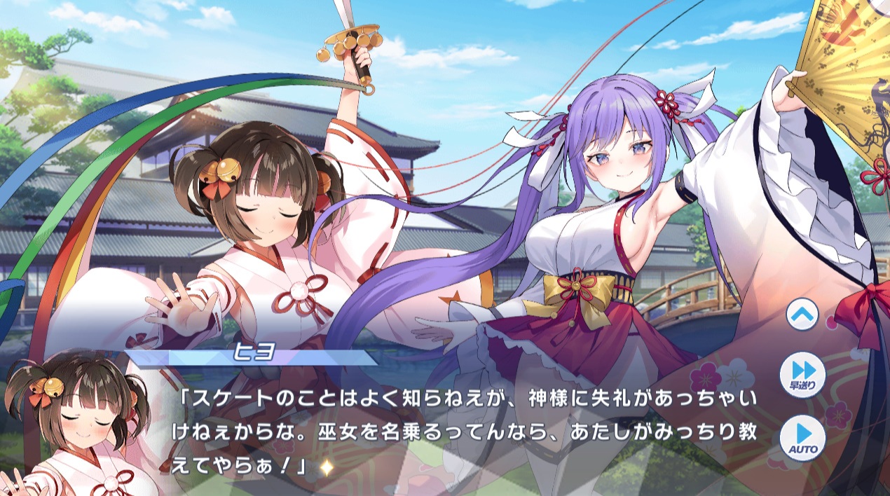 最近表現力が伸び悩んできたのを自覚し、演技の幅を広げるためヘレナに用意してもらった新しい戦闘服。 神楽舞のエッセンスを取り入れようと考え、巫女服風のドレスにしてもらった。 もちろんこの姿でもスケートをすることができ、一級品の演技を披露する。 神楽舞はヨミやヒヨなど本職の巫女から教わっている模様。