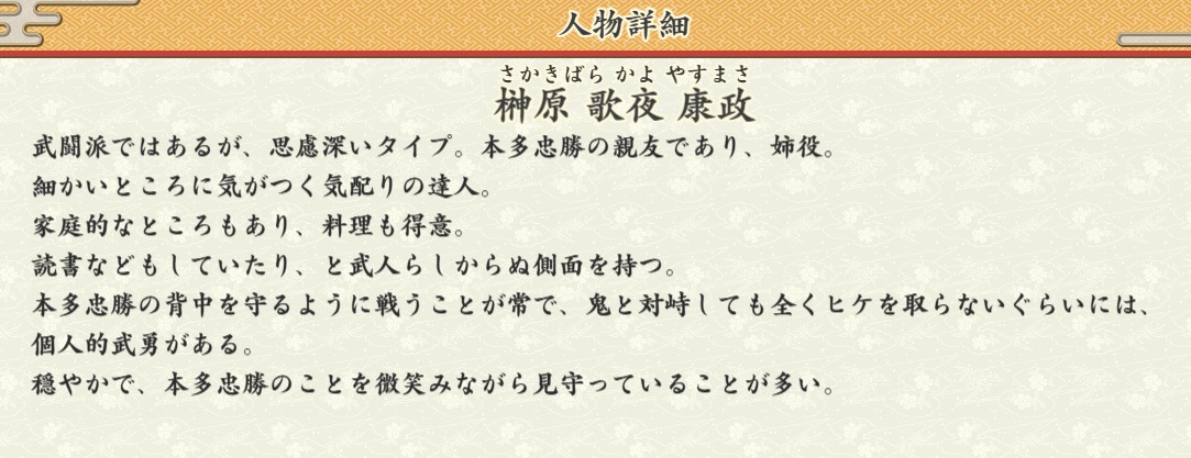武闘派ではあるが、思慮深いタイプ。本多忠勝の親友であり、姉役。