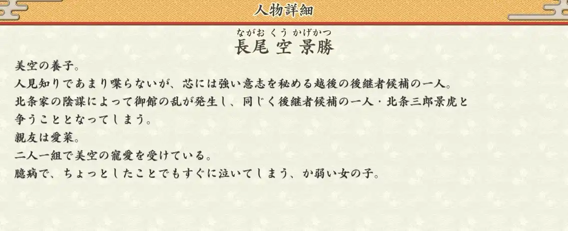 北条家の陰謀によって御館の乱が発生し、同じく後継者候補の一人・北条三郎景虎と争うこととなってしまう。 親友は愛菜。 二人一組で美空の寵愛を受けている。 臆病で、ちょっとしたことでもすぐに泣いてしまう、か弱い女の子。