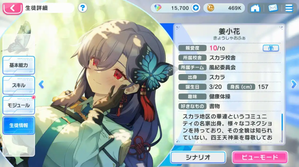 スカラ地区の華連というコミュニティの名家出身。様々なコネクションを持っており、その全貌は知られていない。 四天王神楽を尊敬しており、彼女のためなら多少の無理も押し通す。 辛いものは苦手で隠しているが、周知の事実となっている。