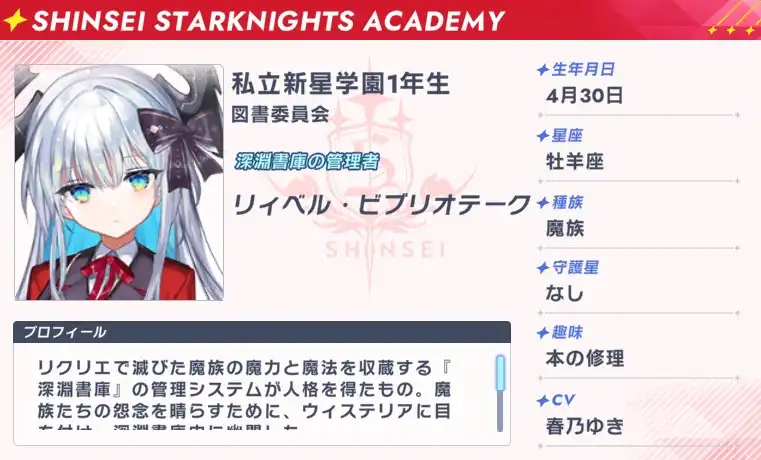 魔族たちの怨念を晴らすために、ウィステリアに目を付け、深淵書庫内に幽閉した。 守護星は持たず、深淵書庫由来の魔力で戦うが、自身の領域である書庫内に比べると、外での戦闘力は控えめ。