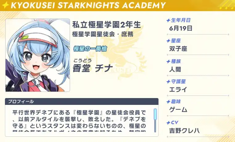 平行世界デネブにある『極星学園』の星徒会役員で、以前アルタイルを襲撃し、敗北した。 『デネブを守る』というスタンスは変わらないものの、 極星の星徒会長であるルヴィネの真意を知るため、暫定的に共闘することになった。 敵に対しては苛烈だが、スケボーやゲームを趣味とする活発な少女の面も持つ。 またカップ焼きそばが好きで、いろいろな味を試している。