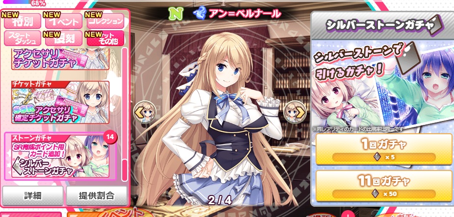 シルバーストーンガチャ(銀)というのあります。通常のSSRキャラがでるのはレインボーストーン(虹)