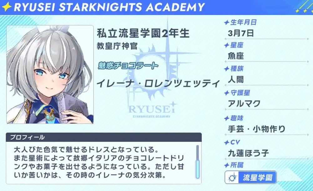 教皇庁から「バレンタインを盛り上げてほしい」と要請を受け、バレンタイン用に調整した戦闘服。 「本当の自分を見てほしい」という願望ゆえか、やはり露出は多めなものの、 クールな印象にまとめ、大人びた色気で魅せるドレスとなっている。 また星術によって故郷イタリアのチョコレートドリンクやお菓子を出せるようになっている。 ただし甘いか苦いかは、その時のイレーナの気分次第。